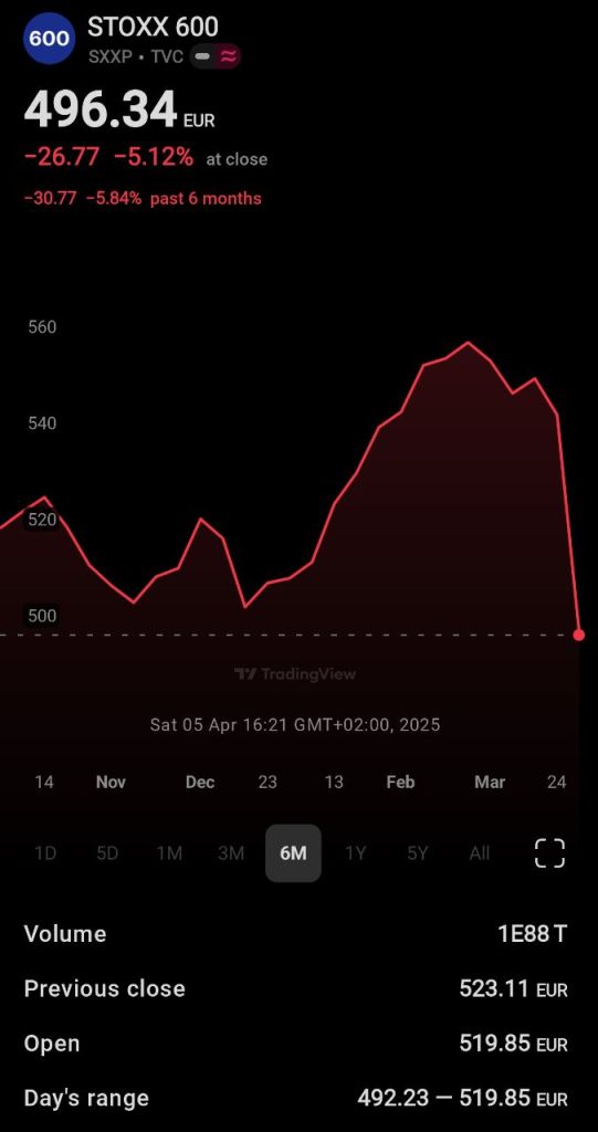 Kako su evropske kompanije odreagovale na uvođenje carina od strane SAD najbolje pokazuje pad indexa Stoxx 600. STOKSKS Europe 600 je berzanski indeks evropskih akcija koji je dizajnirao STOKSKS Ltd. Ovaj indeks ima fiksni broj od 600 komponenti koje predstavljaju velike, srednje i male kompanije sa kapitalizacijom među 17 evropskih zemalja, pokrivajući približno 90% tržišne kapitalizacije slobodnog kretanja na evropskom berzi.
